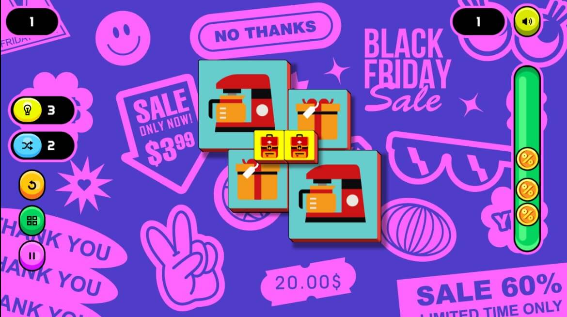 Black Friday Mahjong is a unique twist on the classic tile-matching puzzle game, combining the excitement of Black Friday shopping with the strategic challenge of mahjong. Dive into this free online game where you match tiles to clear the board, all set against a vibrant shopping-themed backdrop. Perfect for casual gamers, this browser-based game is compatible with both desktop and mobile devices, providing a seamless and engaging experience. Enjoy the thrill of shopping without spending a dime, and test your skills in this dynamic and colorful mahjong adventure!